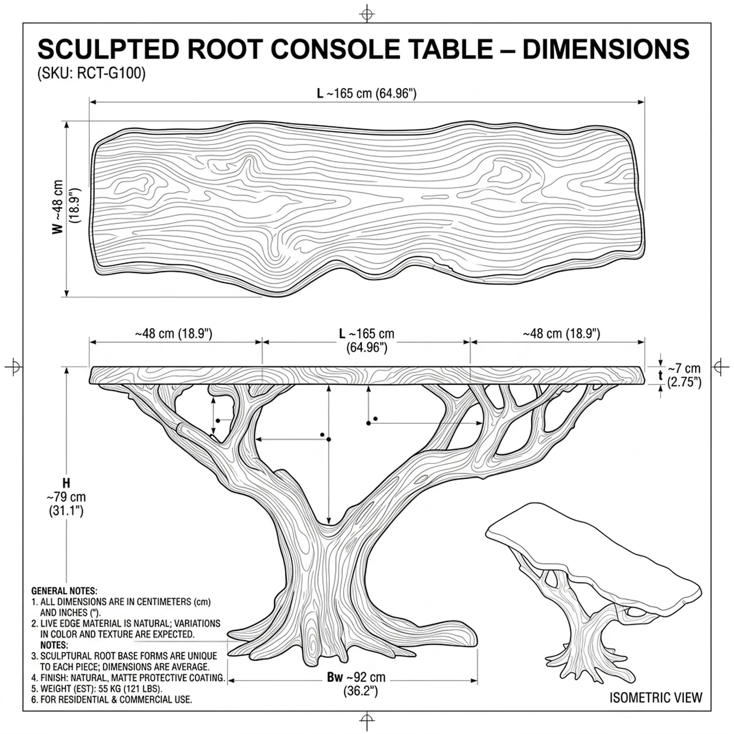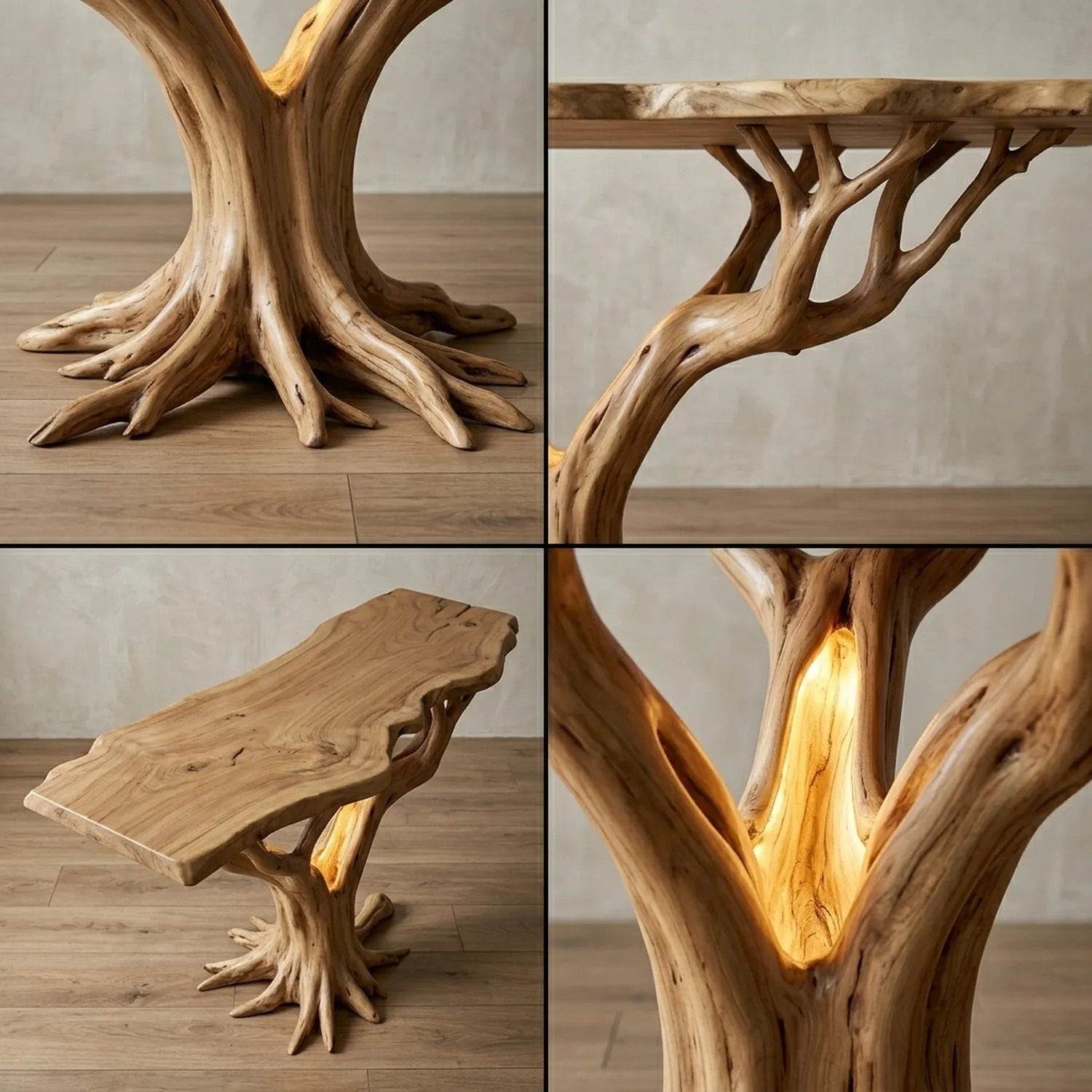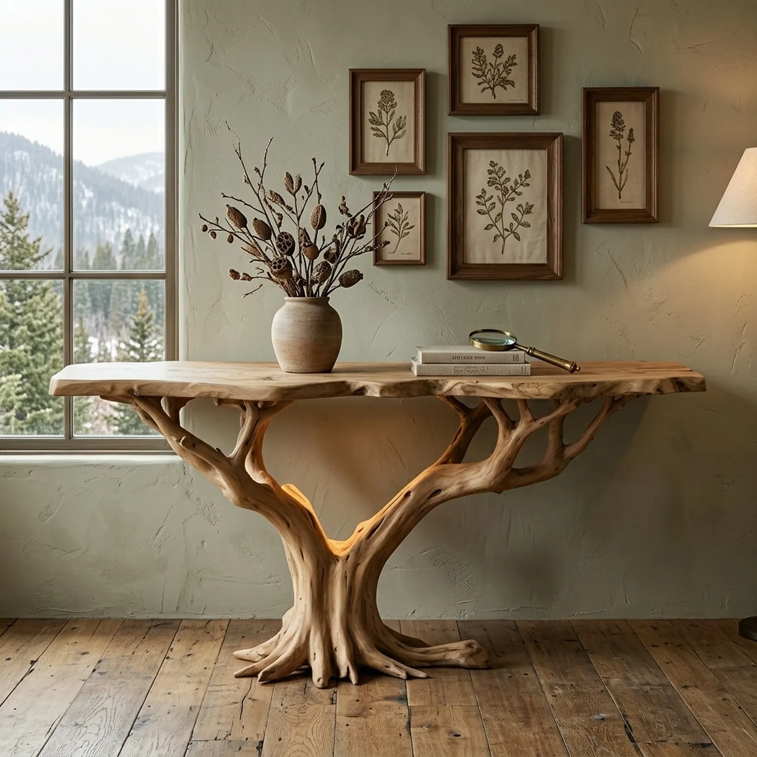 Bring a nature inspired centerpiece into your home with this live edge console table supported by a branching tree base. A thick natural wood top sits above an intricate network of limb like supports that stretch outward before meeting a rooted trunk, creating a canopy effect beneath the surface. The tabletop highlights real wood character, including gentle edge movement and visible grain variation. Underneath, the sculpted branches are smoothed and shaped to follow the natural flow of the material, with small knots and openings that make the base feel light even though it has a strong stance. The overall look blends rustic warmth with a sculptural silhouette. Place it in a living room under artwork to display ceramics, candles, or a fruit bowl, or use it as an entryway statement where the long top can hold daily essentials. Because the base spreads outward, it draws the eye without needing extra decor, making it a good fit for minimalist styling as well. Care for the wood by wiping with a soft cloth and keeping liquids off the surface. Use coasters and avoid direct heat. Natural checking and slight differences in tone are expected, and they add to the individuality of each table.