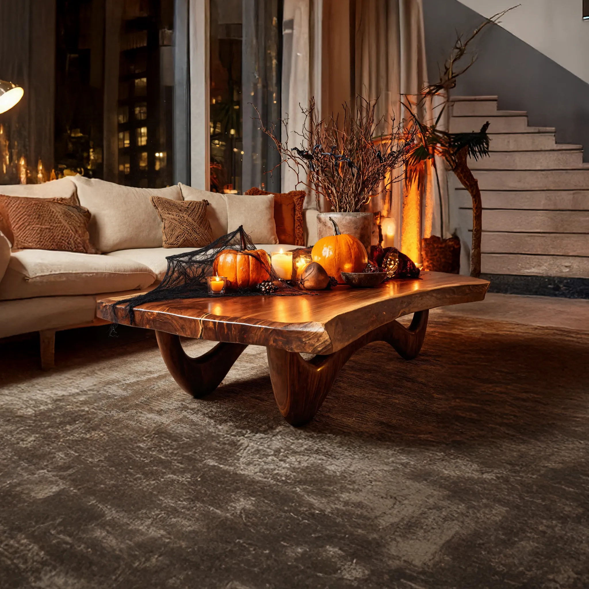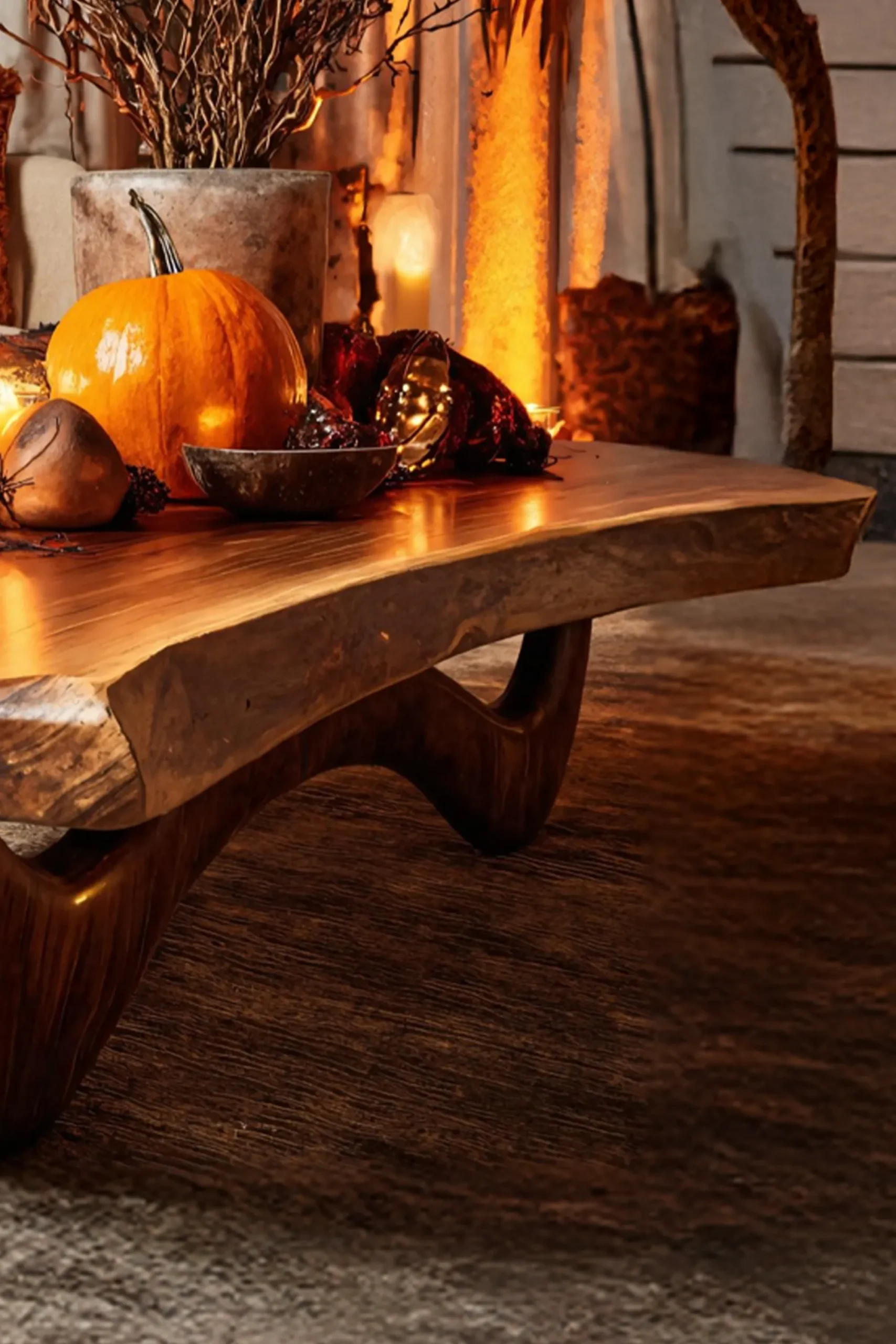 Designed with a dark aesthetic, this modern live edge coffee table creates a bold and sophisticated atmosphere. The deep wood tones emphasize the natural grain and organic edges.