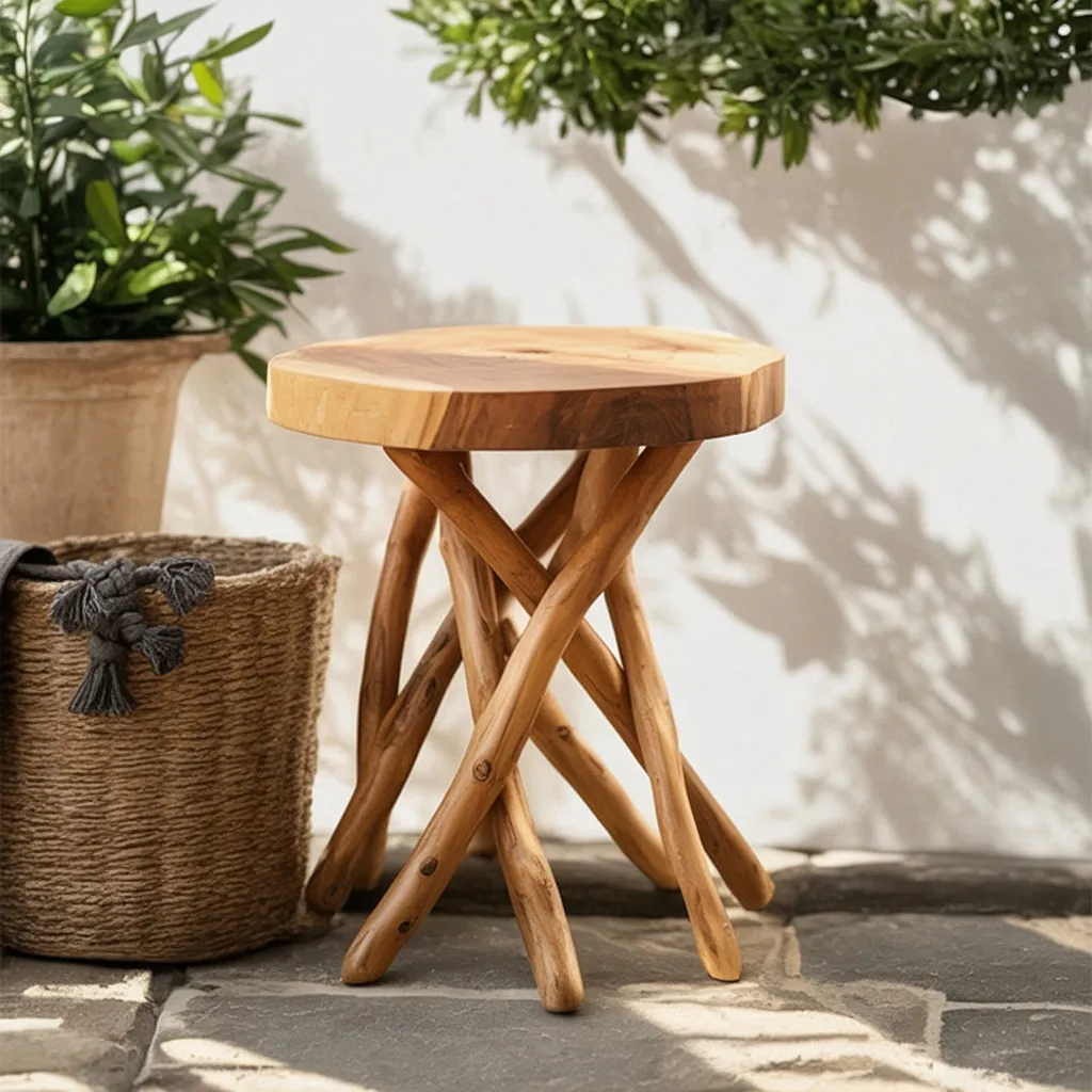 Add an earthy accent to a reading nook or patio corner with this round wood side table featuring a thick circular top and a branch leg base. The tabletop looks like a smooth wood slice with visible grain rings, while multiple rounded legs crisscross underneath to create an open, woven silhouette. The natural wood finish keeps the tone warm and approachable, and the base shows gentle curves and small knots that make the piece feel handcrafted. Because the legs intersect, the structure feels stable while still looking light and airy. This style pairs easily with boho textures, coastal neutrals, and farmhouse decor. Use it as a small spot for a mug and book beside a chair, or as a plant stand where you want height without a heavy pedestal. It can also work as a bedside accent for a lamp and small essentials. The compact footprint makes it easy to move, and the rounded edges help it fit into tighter layouts. To care for the surface, dust regularly and wipe with a damp cloth, then dry. Avoid prolonged moisture, especially outdoors, and use a coaster under drinks. Since each piece uses natural wood, the grain, tone, and minor markings will vary, giving every table its own personality.