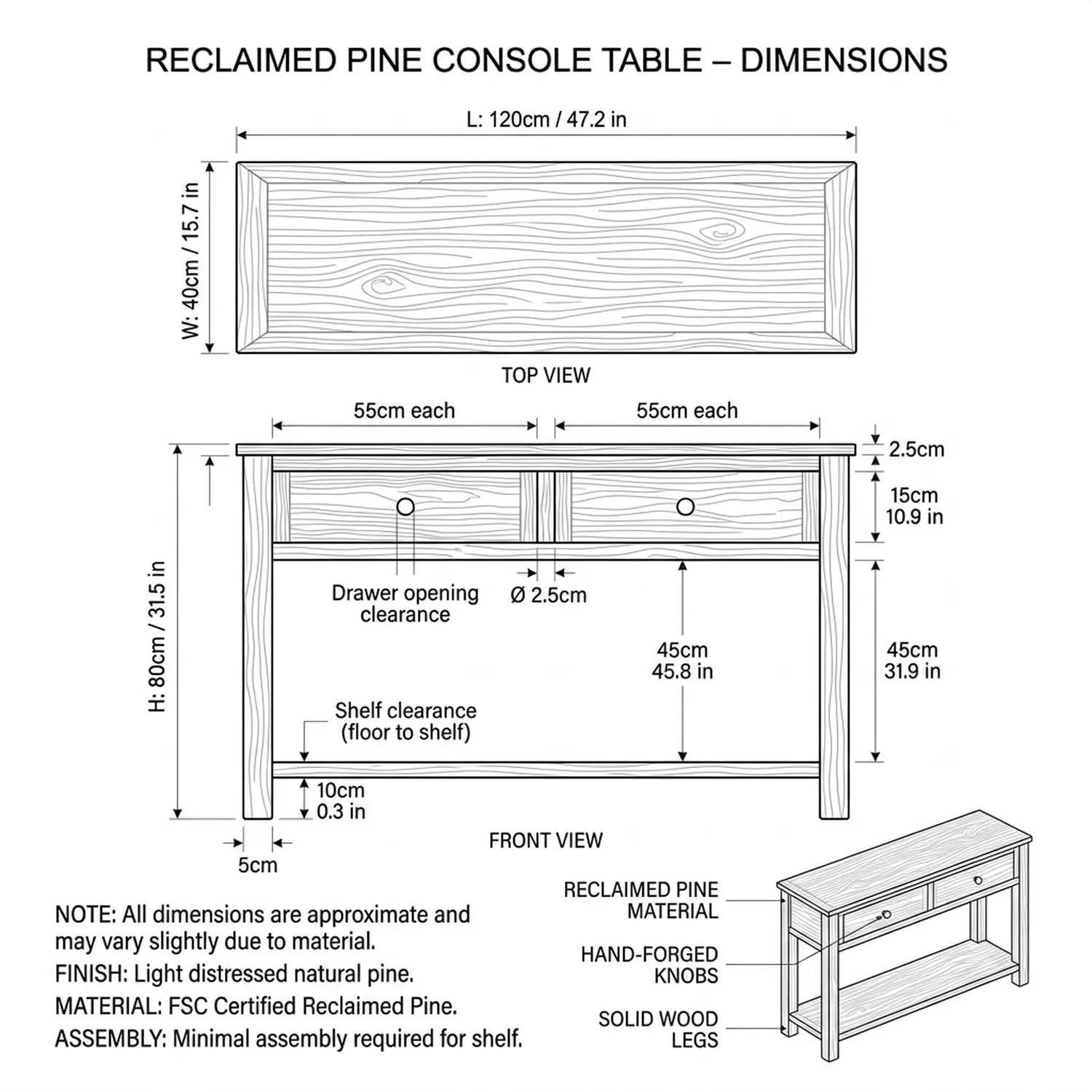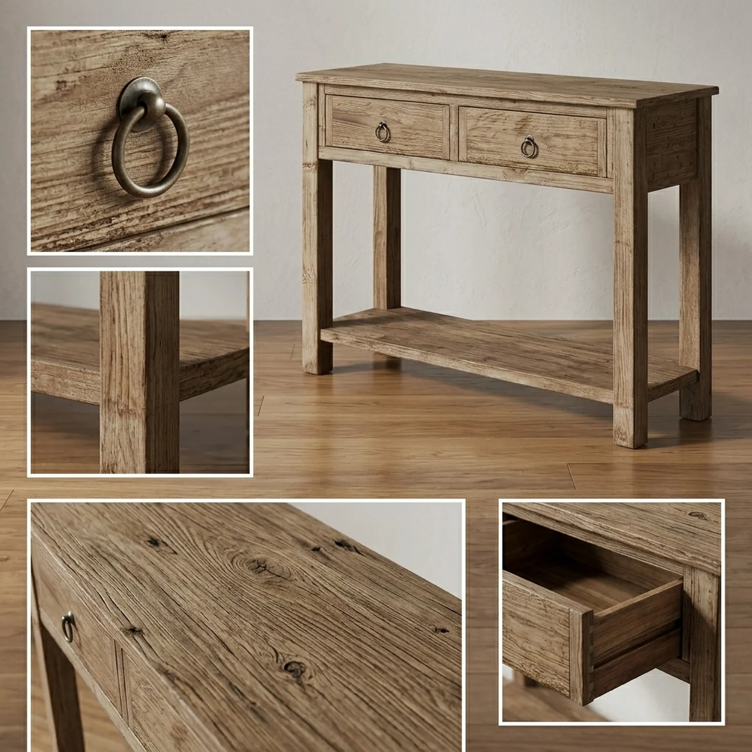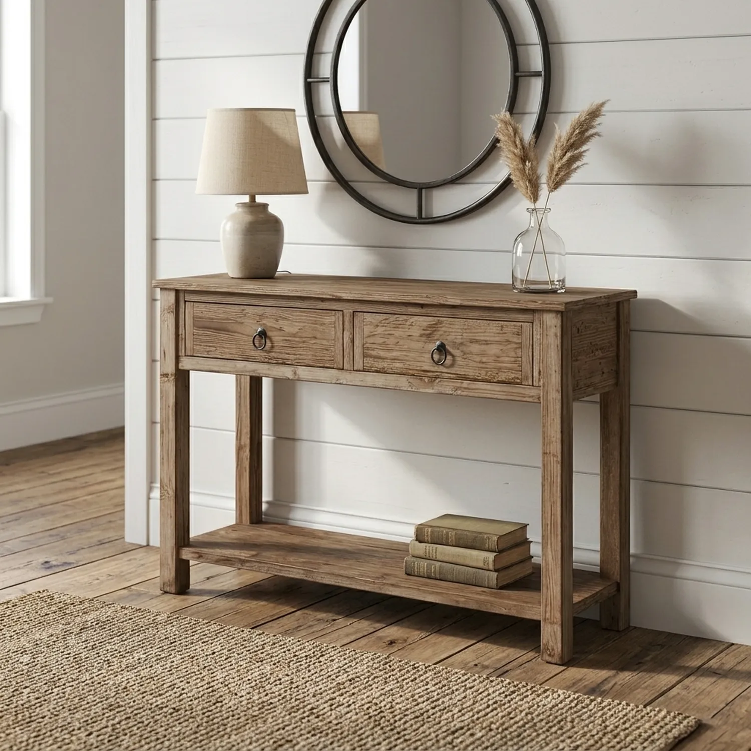 Add practical storage to an entryway with this rustic wood console table featuring two drawers and a full length lower shelf. The rectangular top has a textured grain look, and the drawer fronts are finished with round black knobs for a simple farmhouse touch. Two side by side drawers help hide smaller essentials such as keys, chargers, or receipts, keeping the top clear for decor. The open shelf below is ideal for baskets, shoes, or seasonal items, and the straight leg frame keeps everything stable and easy to fit against a wall. A slightly distressed surface adds warmth without feeling overly rough. This piece works well behind a sofa, in a hallway under a mirror, or as a compact serving surface in a dining area. Try styling it with a table lamp, a shallow tray, and a vase to create a calm drop zone. The warm wood tone pairs easily with neutral walls, woven storage, and black metal accents. With its clean lines and built in organization, it can support everyday routines without demanding attention. To maintain the finish, wipe with a soft cloth and use coasters under drinks and candles. Avoid abrasive cleaners and direct heat. As with most wood furniture, slight color variation and grain pattern changes are expected, which helps each table feel unique.