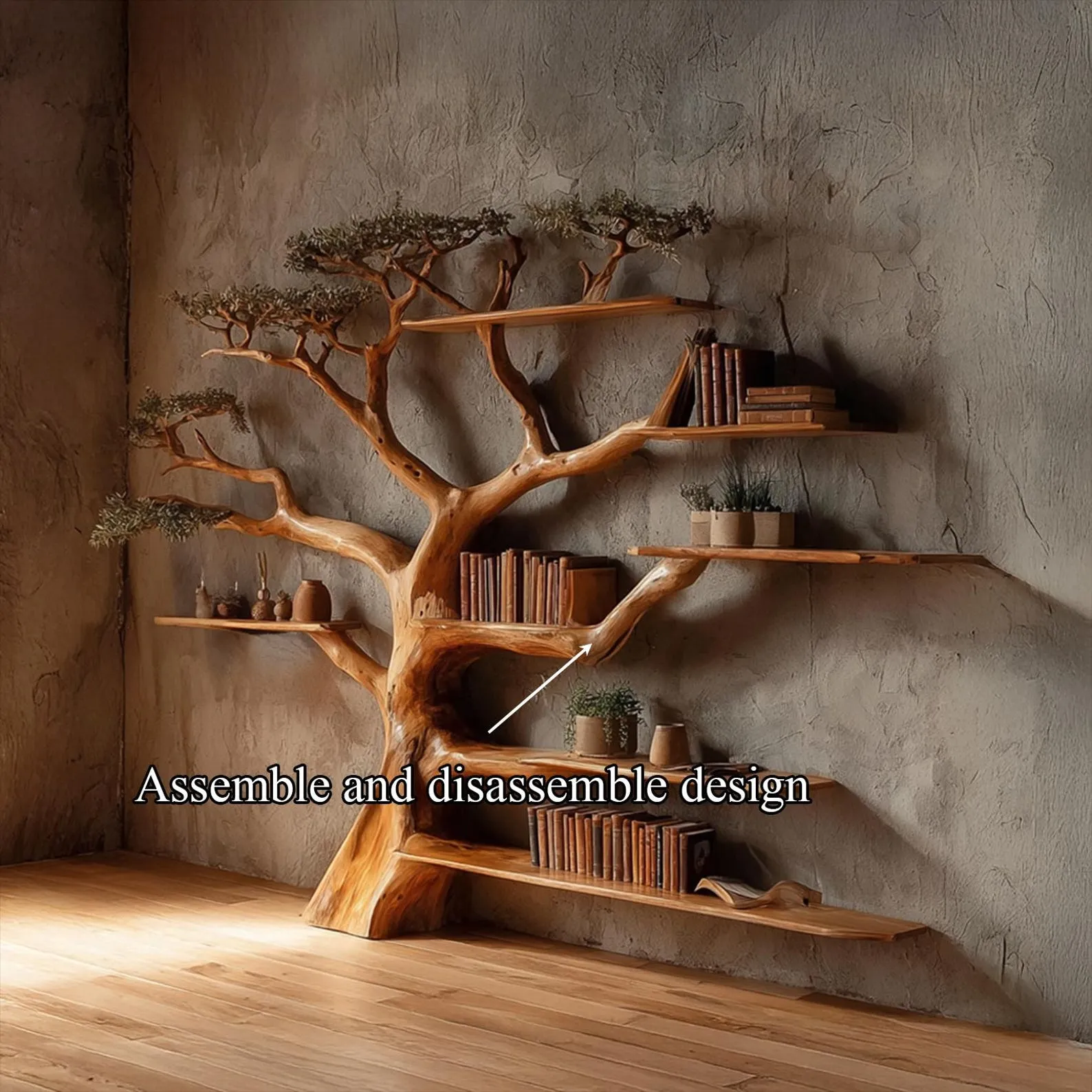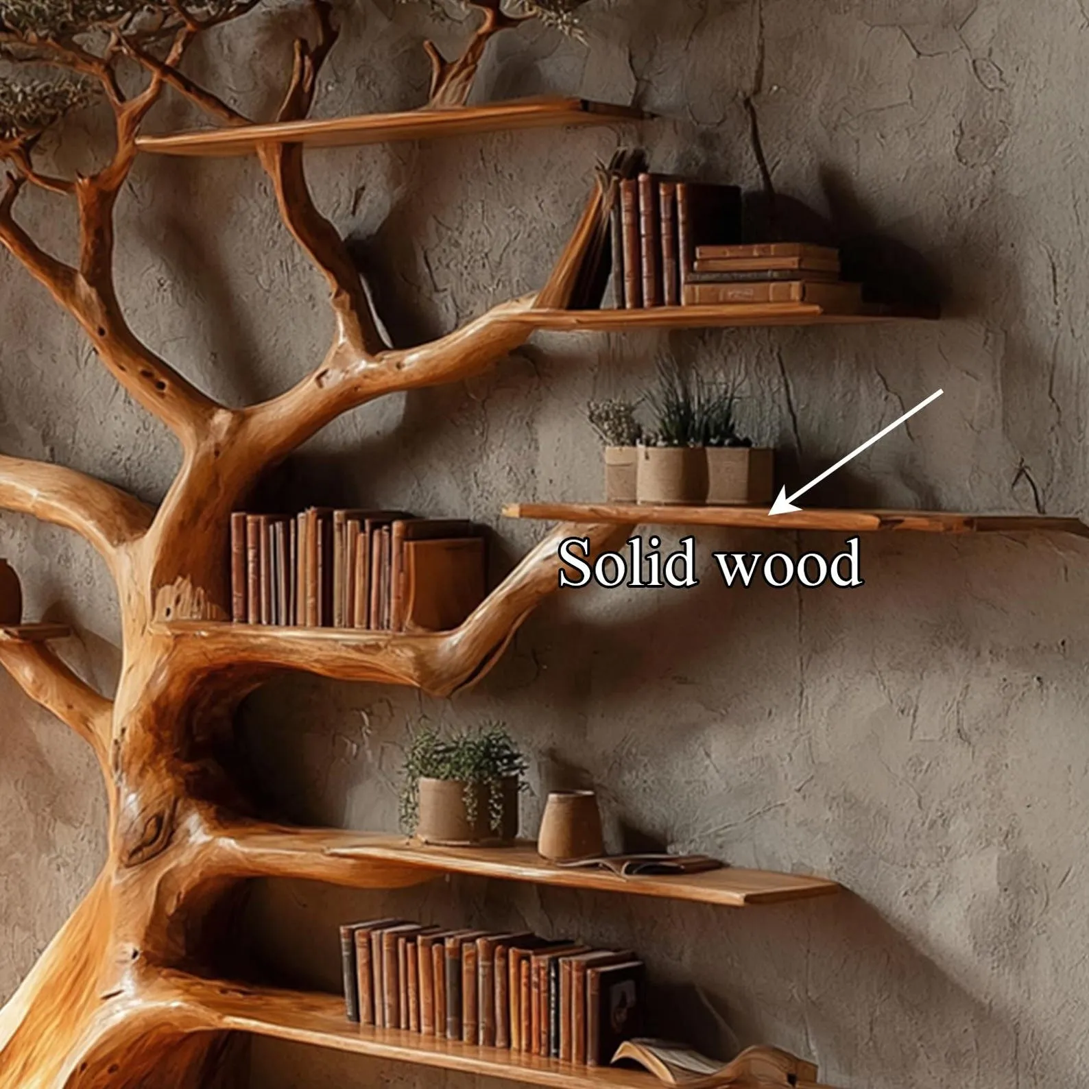 This wall mounted tree shape bookshelf turns a blank wall into a playful storage area. Branch like shelves extend from a central trunk, creating separate spots for novels, picture books and decorative objects. Crafted from natural wood, the piece highlights grain patterns and subtle variations in color for a warm, organic feel.